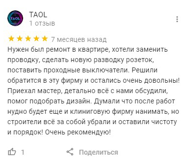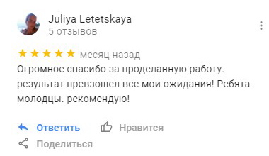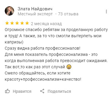 "Хочу выразить огромную благодарность компании PREMIUM-REMONT, в лице Сергея и Алексея и абсолютно всех людей, причастных к ремонту! Персонал и бригада вежливые, отзывчивые и самое главное адекватные, тактичные и человечные люди, профессионалы своего дела помогающие абсолютно во всем!