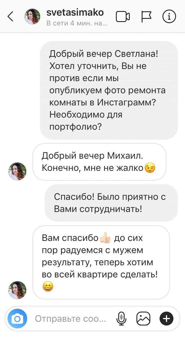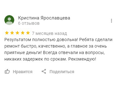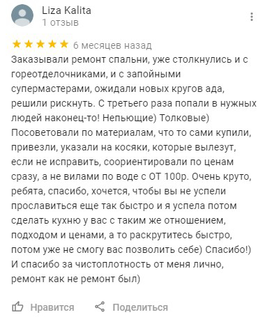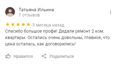 Это очень важно, когда начинаешь ремонт и ждешь хорошего результата. Импонирует, что работы оговариваются заранее и стоимость известна на начальном этапе (подробная калькуляция, не было перерасхода ни по материалам, ни по стоимости работ)."